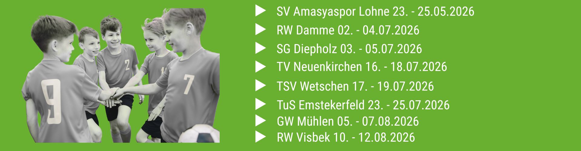 Unsere Fußballcamps finden vorrangig in den Ferien statt und bieten ein dreitägiges Programm, das den Kindern ein rundum professionelles Trainingserlebnis ermöglicht. Die Teilnehmenden werden in Altersgruppen eingeteilt und intensiv von unseren erfahrenen Trainer betreut.